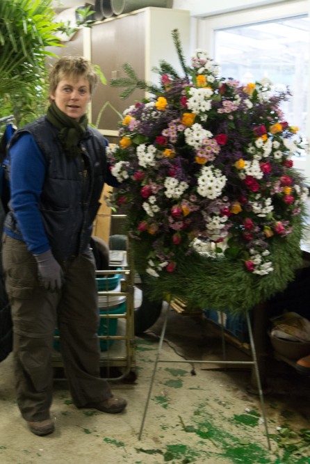 Klassisch verwendete Blumen sind hier die Rosen, Dahlien, Astern und Lorbeer.